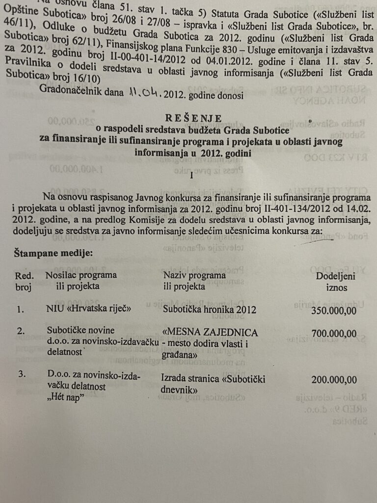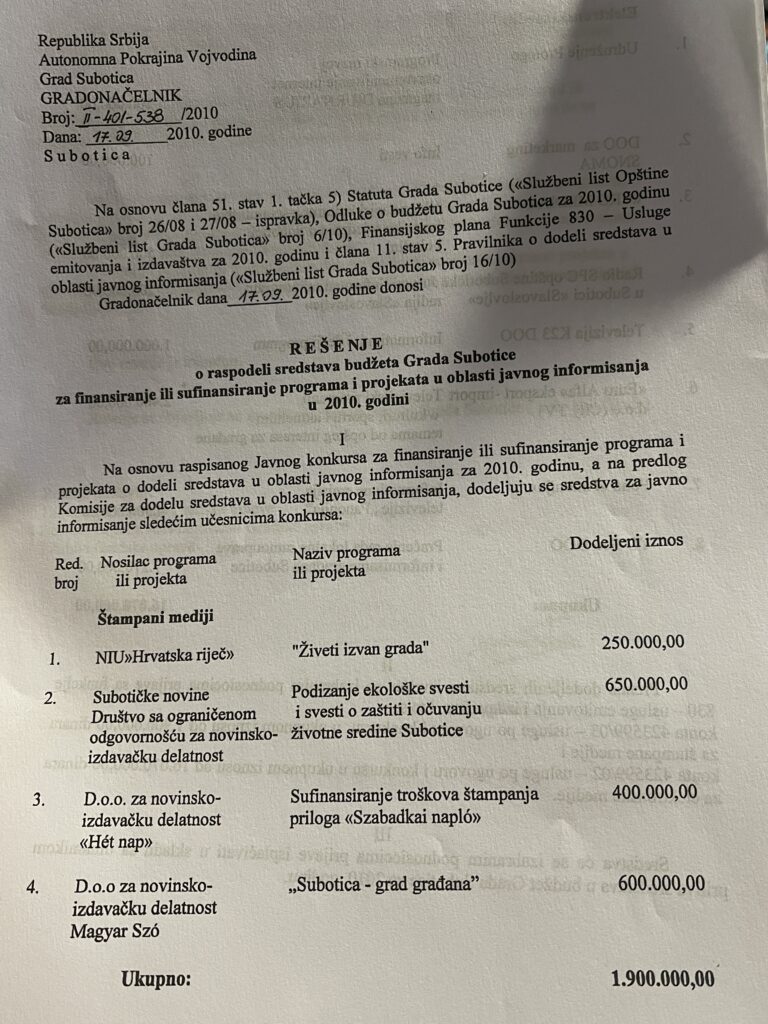 Több mint két évtizednyi adat a médiatámogatási gyakorlatról azt mutatja: a közpénzből finanszírozott pályázati rendszer mára nem a sajtó sokszínűségét, hanem egy szűk médiakör stabil működését szolgálja. Miközben az önkormányzat évente tízmilliókat oszt szét „közérdekű tájékoztatásra”, a nyertesek listája alig változik – és egyre inkább felmerül a kérdés: valóban a legjobb projektek nyernek, vagy a politikai közelség számít? Amikor Szabadkán médiatámogatásról döntenek, a végeredmény gyakran már előre sejthető. A pályázati rendszer ugyan a közérdekű tájékoztatást hivatott szolgálni, de az elmúlt évek gyakorlata alapján inkább egy jól körülhatárolható médiakör finanszírozási mechanizmusává vált.