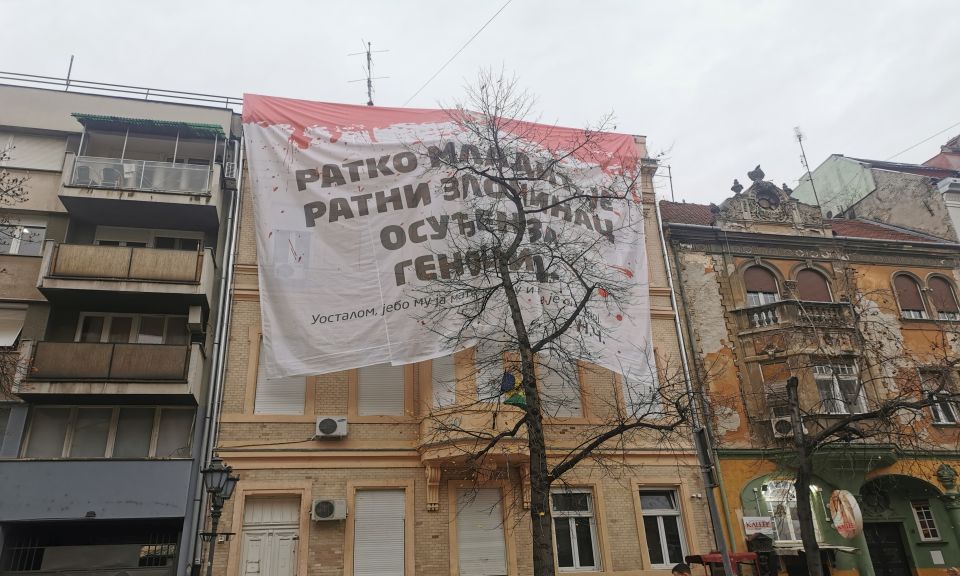 A Vajdasági Szociáldemokrata Liga (LSV) újvidéki székházán csütörtökön reggelre egy közel kétemeletnyi nagyságú, „vérrel mocskolt” transzparenst helyeztek ki, amely azt üzeni: Ratko Mladić háborús bűnös.