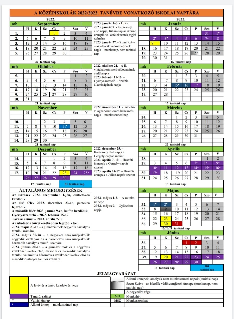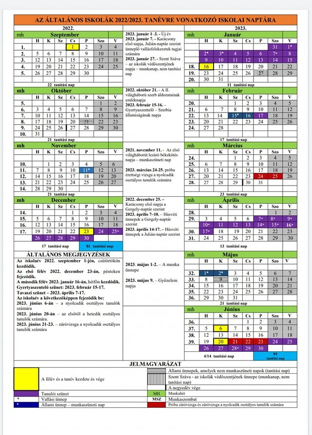 A Tartományi Oktatási, Jogalkotási, Közigazgatási és Nemzeti Közösségi Titkárság megjelentette a 2022/23-as tanévet meghatározó iskolanaptár szabályzatát. Ennek értelmében az első félév 2022. szeptember 1-jén kezdődik és 2022. december 23-án, pénteken fejeződik be. Az első félévben a tanítási napok száma 81.