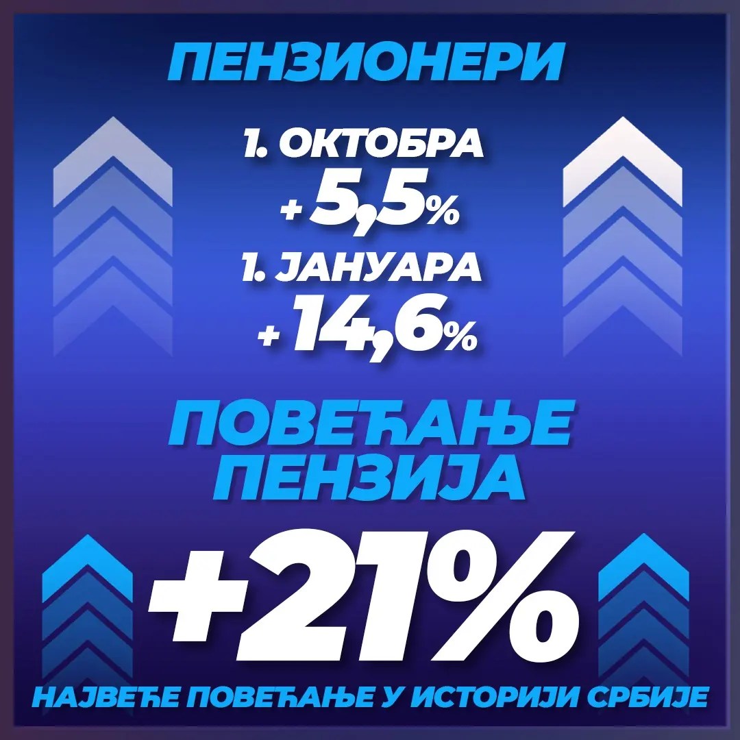 A 2023-as évben előbb egy rendkívüli nyugdíjemelés lesz október elsején, amely után a nyugdíjak 5,5 százalékkal lesznek nagyobbak a jelenlegi járandóságnál. Az emelés az októberi nyugdíjakra vonatkozik majd, amelyet november eleje és tizedike között kapnak készhez azok, akik erre jogosultak. A rendszeressé tett nyugdíjemelésre 2024. január elsején kerül sor, amikor a nyugdíjak 14,6 százalékkal növekednek. Érdekesség, hogy a Szerb Haladó Párt tagjai nyakra-főre osztogatják azt a bejegyzést, amely öle betűkkel és számokkal hirdeti, hogy minden idők legnagyobb nyugdíjemelése vár a legidősebb polgárokra, s ez az emelés 21 százalékos lesz. Na mármost, ha összeadjuk a 14,6-ot és az 5,5-öt, akkor az 20,1 százalék, ami sokkal közelebb van a húszhoz, mint a huszonegyhez, de hát, ahogy szokták mondani, kicsire nem adunk, aztán a legtöbb ember úgyis elhiszi, amit lát, nem számol utána.