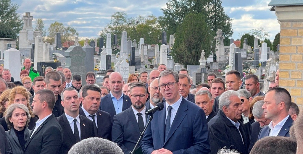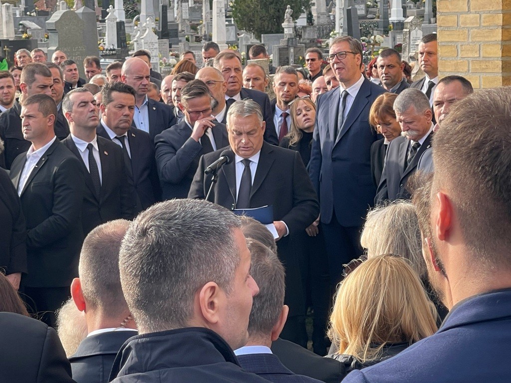 „Szerbek és magyarok, anyaországi és külhoni magyarok együtt veszünk búcsút harcostársunktól, aki bátor férfi, erős vezető, kiváló katona volt. Katonaként élt, katonaként harcolt és katonaként is ment el. Nemcsak azt tudta hogyan kell élni, hanem azt is, hogyan kell emelt fővel meghalni. Sohasem terhelte munkatársait és barátait a saját gondjával, csak tette a dolgát, egészen addig, amíg megérkezett az égi sasbehívó. Mi pedig most megtörten és zavartan állunk itt Vučić elnök úrral egy magyar férfi koporsója felett, aki egybekovácsolt bennünket, amiért nem lehetünk elég hálásak neki. Érezzük a ránk hagyott politikai örökség súlyát. Pontosan tudjuk, hogy milyen ritka, hogy a korábbi ellenségek barátokká váljanak”, fogalmazott Orbán, majd azt mondta: