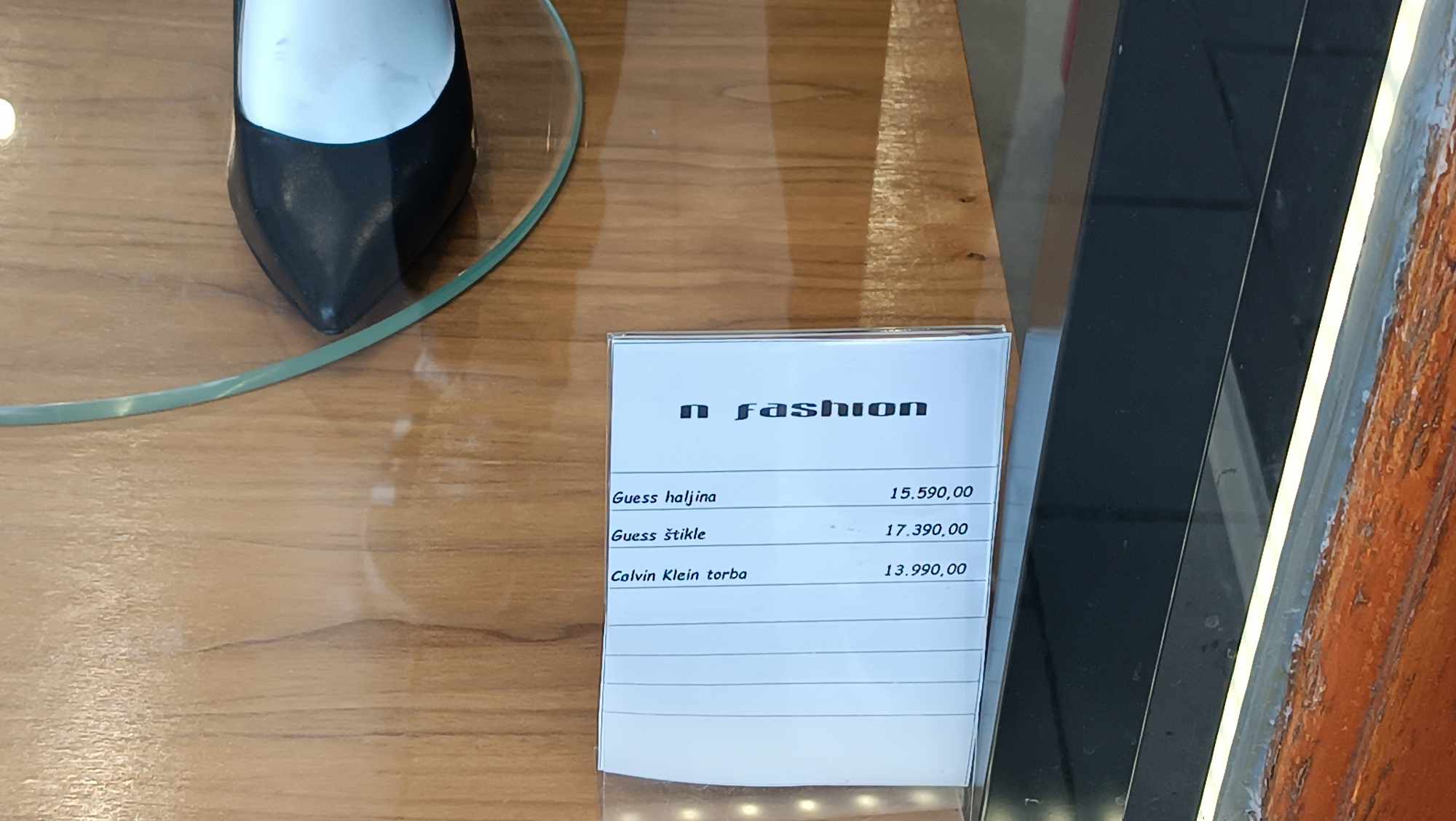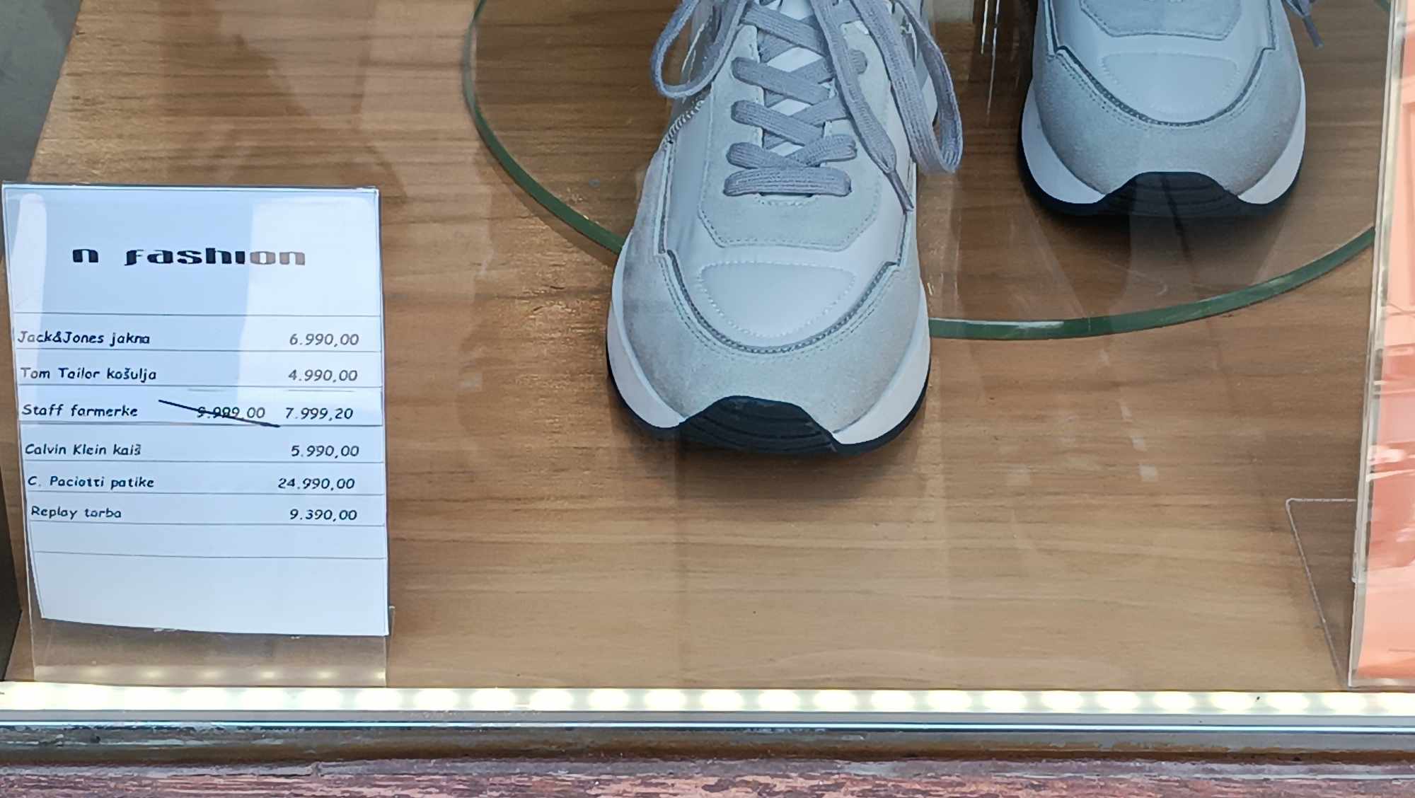 Az üzletben a próbababán lévő Guess ruha 15.590 dinár, a hozzá illő magassarkú 17.390, míg a kisméretű Calvin Klein táska 13.990 dinár. A másik próbababa is igen stílusos, a kabát 6.990 dinár, a Tom Tailor ing 4.990, a farmernadrág 7.999, Calvin Klein nadrágszíj 5.990 dinár, a C Paciotti sportcipő 24.990 dinár, míg a Replay táska 9.390 dinárba került.Előző héten ugyanitt egy Karl Lagerfeld cipőt raktak ki a kirakatba, amely 30.000 dinár körül mozgott.