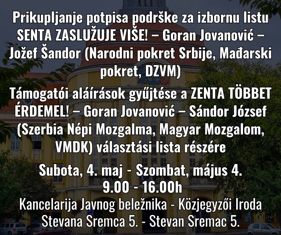 A Zenta többet érdemel képviselői hozzátették, hogy pár óra alatt már mintegy ötven aláírást gyűjtöttek, s az induláshoz szükséges kétszáz támogatói aláírások gyűjtését szombaton, május 4-én folytatják a zentai közjegyző irodájában (Stevan Sremac utca 5.) kilenc órától. Arra kérik azokat a zentaiakat, akik szerepelnek a választói névjegyzékben, és fontos számukra a város jövője, hogy szombaton 9 és 16 óra között hozzák magukkal a személyi igazolványukat és aláírásukkal járuljanak hozzá a lista indulásához a június 2-ai választáson.