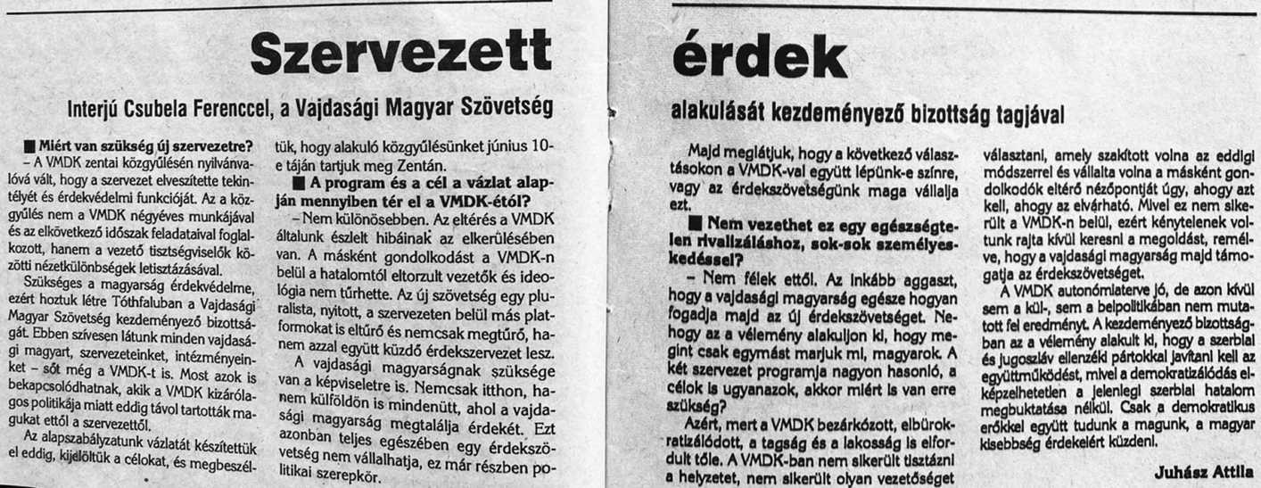 Minden többi eseményről már az újságokból értesültem, mert június végéig Németországban voltam az ottani háborúellenes szervezetek meghívására. Így tudtam meg, hogy május végén a kezdeményezők tábora „kibővült” egy új szabadkai találkozón, immár arról kezdtek beszélni, a VMDK-val elégedetlen szabadkai értelmiség egy csoportja (fogalmam sincs, hogyan lettünk Csubela Ferenc, dr. Hódi Sándor és én szabadkaiak), így szerveztek meg egy találkozót az újvidéki „hasonszőrűekkel”, majd semmibe véve a tóthfalusi döntéseket, megtörtént a VMSZ megalakulása, de nem 10-én, hanem 18-án.