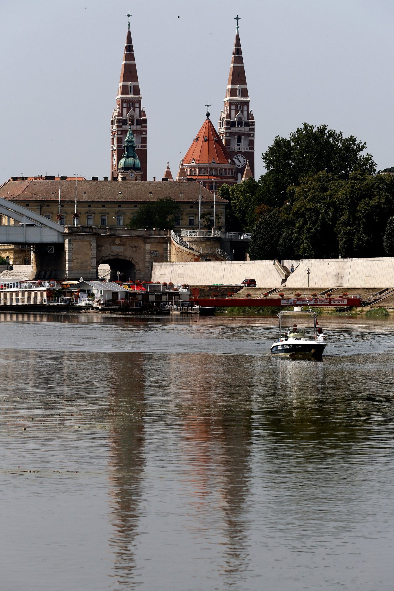 A Marosmenti Polgárőr Egyesületnek adományozott kishajó a Tiszán Szegednél 2024. július 8-án. Az új kishajóval a vízi forgalom figyelemmel kísérése, az esetleges mentési feladatok ellátása mellett az illegális migráció felderítésében is részt vesznek a polgárőrök a Maroson és a Tisza alsó szakaszán. (Fotók: MTI/Lehoczky Péter)