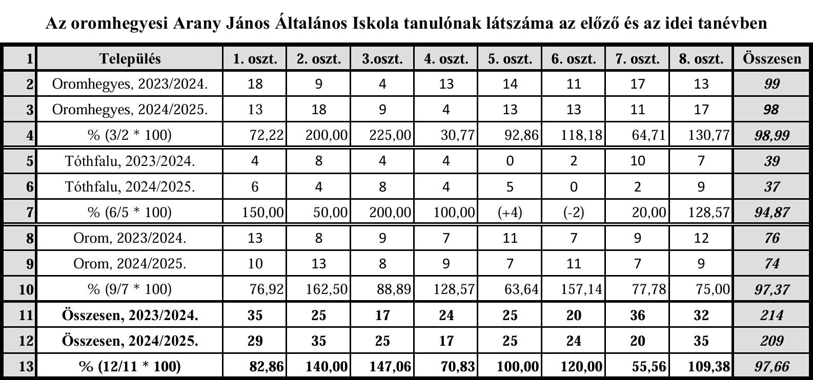 Látható, hogy Oromhegyesen, Oromon és Tóthfaluban is csökkent a tanulók létszáma, és szinte lehetetlen a csökkenés folyamatát megállítani. Akkor, amikor én Oromhegyese kerültem (1977/1978-as iskolaév) csak a két nyolcadik osztályban annyi tanuló volt, mint az idei évben összesen az oromi iskolaépületben. 1978-ban jött létre az integráció a négy (öt) település két általános iskolája között. Akkor Oromhegyesen és Tóthfaluban összesen több mint 600, Oromon Völgyesen és Újfaluban (itt az integrációt követően szűnt meg az általános iskolai oktatás) pedig összesen több mint 500 gyermek volt beiskolázva.