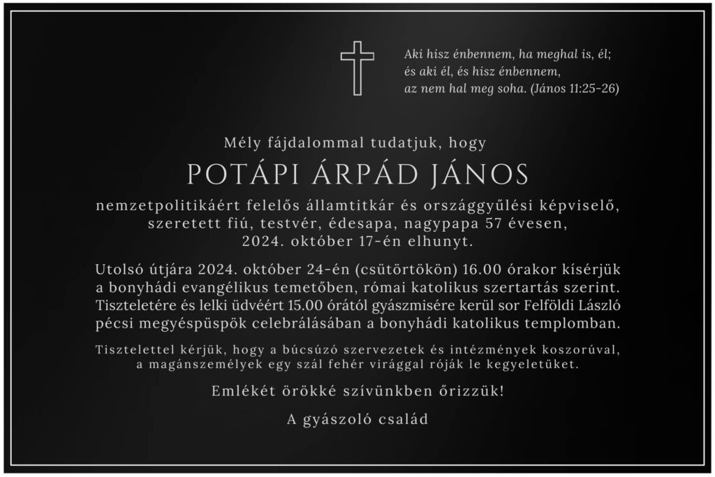 Potápi Árpád János temetésére 2024. október 24-én csütörtökön 16 órakor kerül sor a bonyhádi evangélikus temetőben, ahol római katolikus szertartás szerint helyezik végső nyugalomra, jelentették be a politikus Facebook-oldalán. Az eseményt megelőzően gyászmisét tartanak Felföldi László pécsi megyéspüspök celebrálásában a bonyhádi katolikus templomban. Az elhunyt politikus emlékére a család kérésére a búcsúzó szervezetek és intézmények koszorúval, a magánszemélyek egy szál fehér virággal róhatják le kegyeletüket.