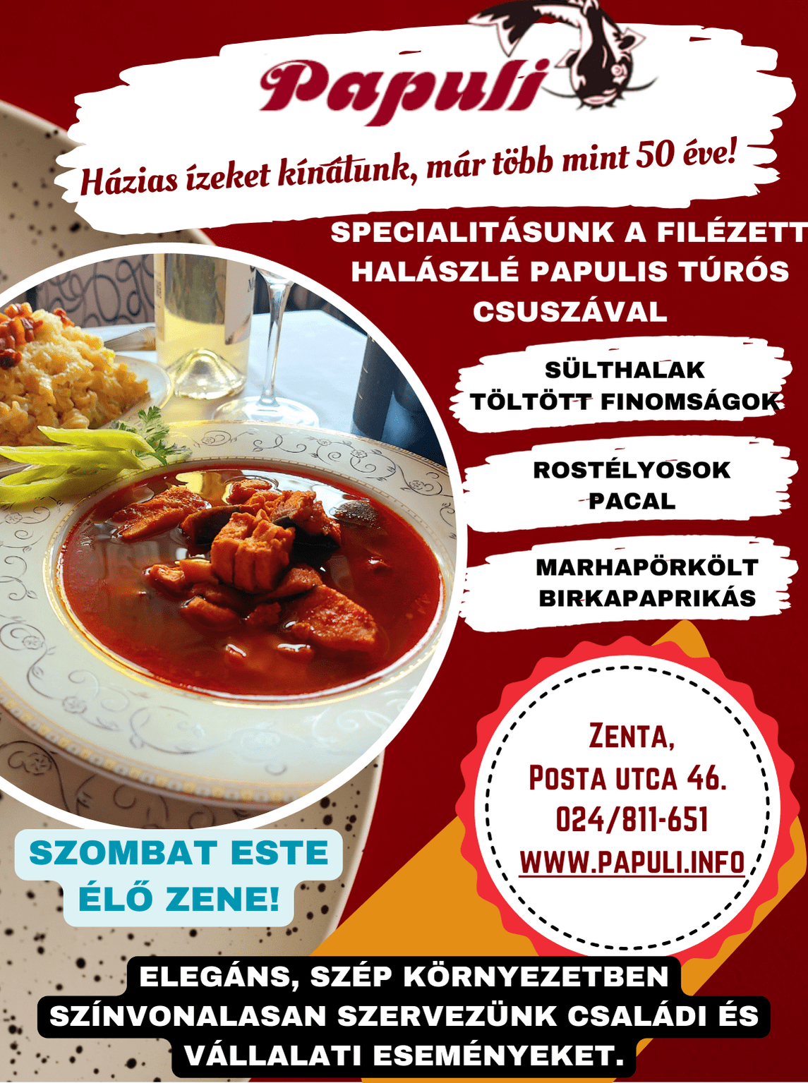 A környék legfinomabb halászleve, minőségi húsból és alapanyagokból készült frissensültek és élőzene – évtizedek óta ez jellemzi a zentai Papuli éttermet, amely nemrég – egy gyönyörű apartmanháznak köszönhetően – szálláshely biztosításával bővítette kínálatát. Arról, hogy mikor vált a Papuli messze földön híressé, változik-e a jövőben az étlapján a kínálat, miért az egyik legszebb és egyben a legnehezebb szakma a vendéglátás, a Papulit 2008 óta vezető Gere Zsíros Elvirával beszélgettünk.