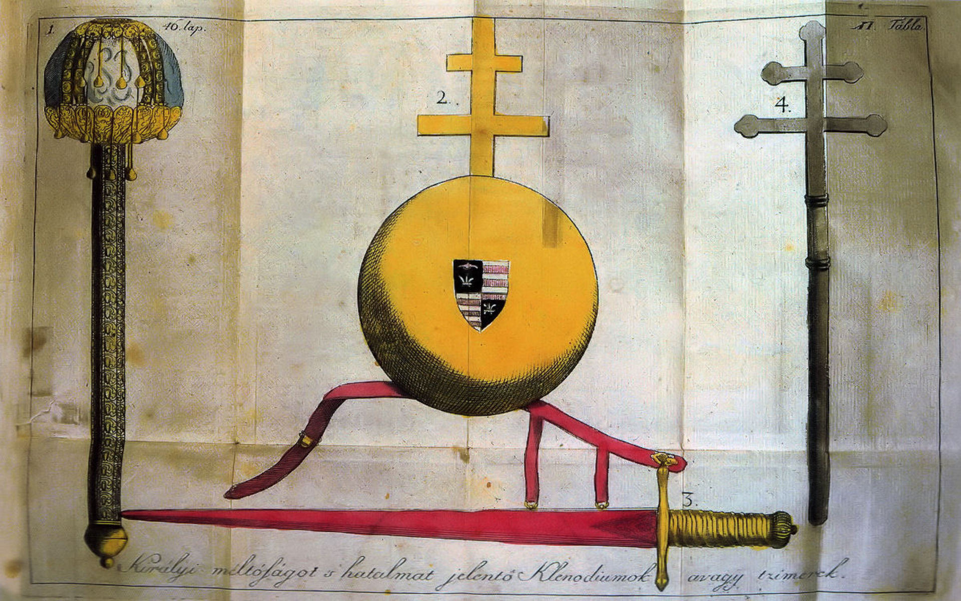 Az első, mondjuk hiteles, az országalmát ábrázoló művészi munka Decsy Sámuel 1792-ben Bécsben megjelentetett A magyar szent koronának és az ahhoz tartozó tárgyaknak historiája című munkájában található. Mindez azért érdekes, mert a Thuróczy által készített krónikában látható királyábrák egyikén sem kettős kereszttel díszített koronázási tárgyat láthatunk. Aztán jön még egy meglepetés, mert magán az országalmán egy addig sehol sem látott címer is ékeskedik. Ahhoz, hogy ennek értelmét megfejthessük, elő kellett venni a jelenlegi technikát, azaz ki kellett nagyítani, majd segítségül kellett hívnom a mesterséges intelligenciát, mondja már meg nekem, az a címer kinek vagy minek a jelképe.