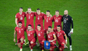 Serbia’s players pose for a team photo prior the start of the World Cup group G soccer match between Serbia and Switzerland, in Doha, Qatar, Friday, Dec. 2, 2022. (AP Photo/Luca Bruno)