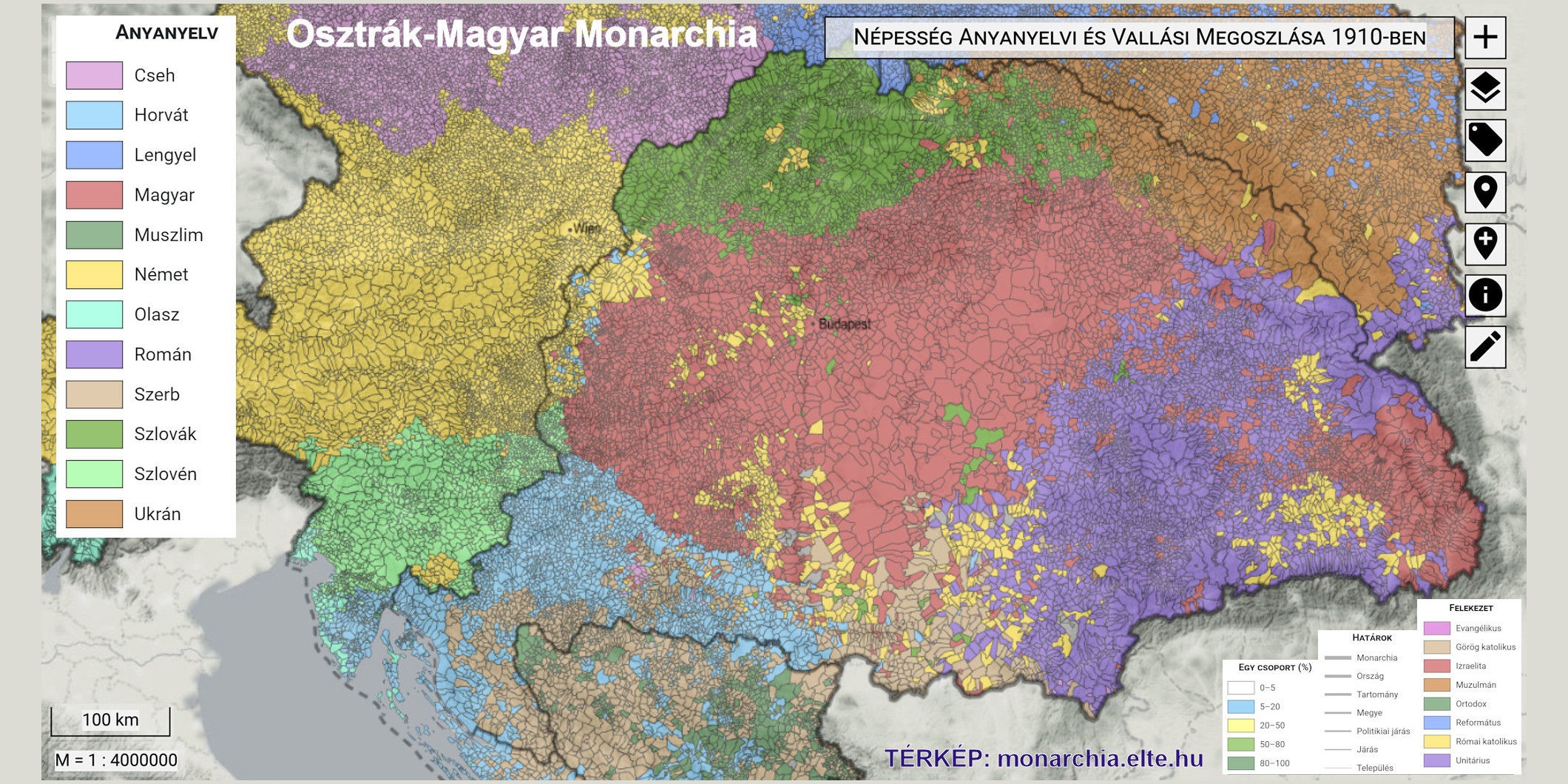 Az Osztrák-Magyar Monarchia anyanyelvi és vallási térképe 1910 (Forrás: http://monarchia.elte.hu)
