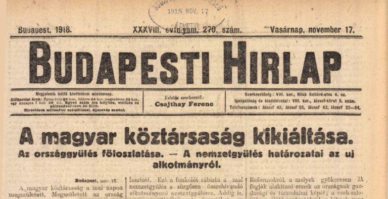 A Budapest Hírlap 1918. november 17-ei számának címlapja a köztársaság kikiáltásáról (Digitálsi másolat: ADT)