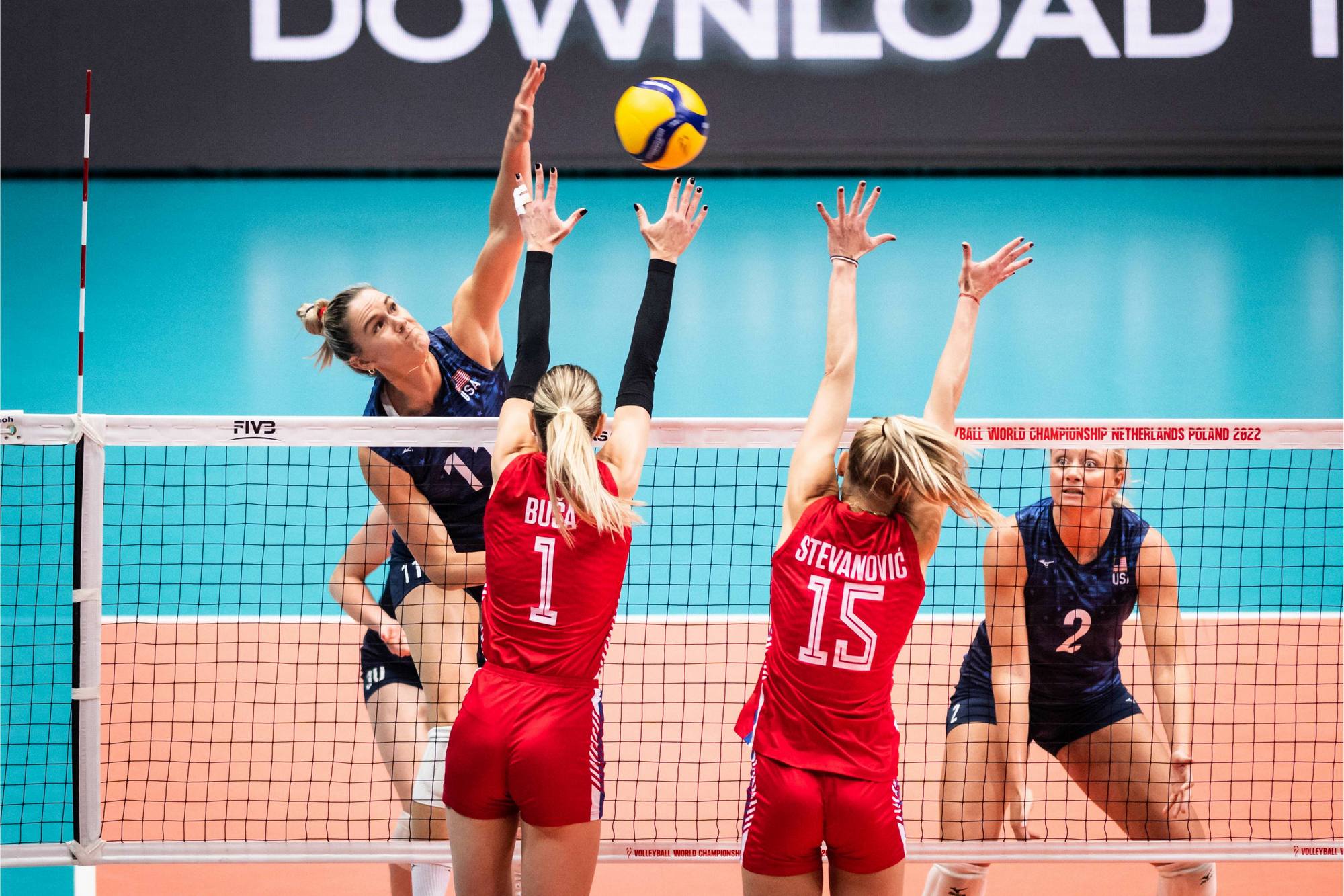 Gljivicej, 12.10.2022. – Odbojkasice Srbije i SAD u akciji tokom utakmice polufinala na Svetskom prvenstvu, danas u Gljivicama. (BETAPHOTO/FIVB)