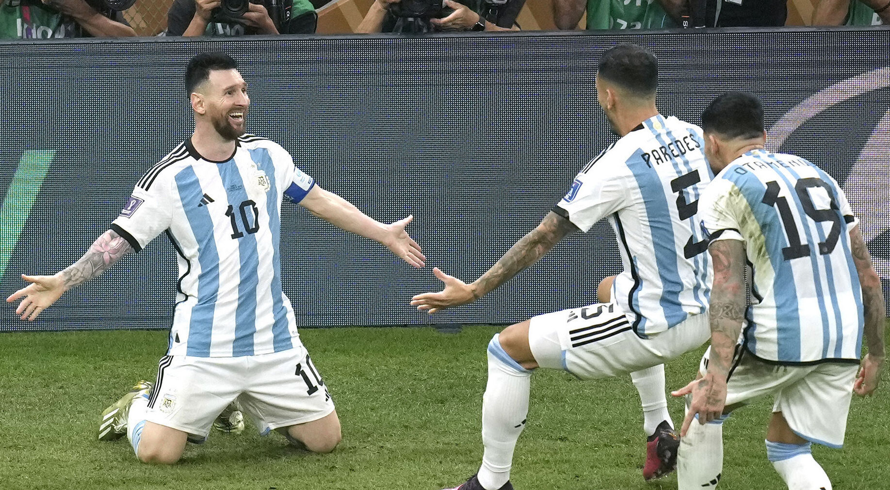 Argentina’s Lionel Messi, left, celebrates his side’s third goal during the World Cup final soccer match between Argentina and France at the Lusail Stadium in Lusail, Qatar, Sunday, Dec. 18, 2022. (AP Photo/Christophe Ena)