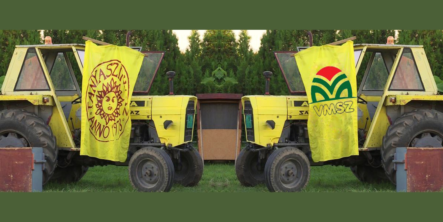 Szembe állított traktorok Tanyaszínház és VMSZ logóval